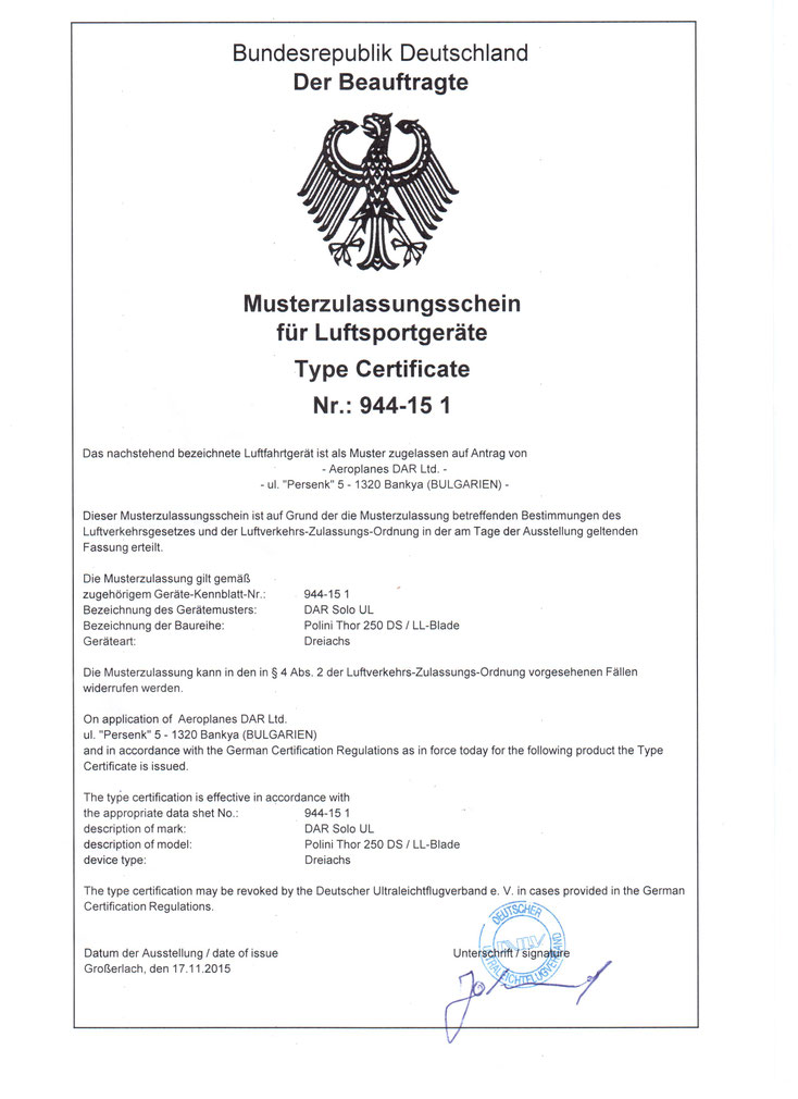 On 17.11.2015 the plane received its Musterzulassungsschein für Luftsportgeräte certificate – Nr.:944-15 1, issued by DULV (Deucher Ultraleichtelugverband). This certificate is not only a